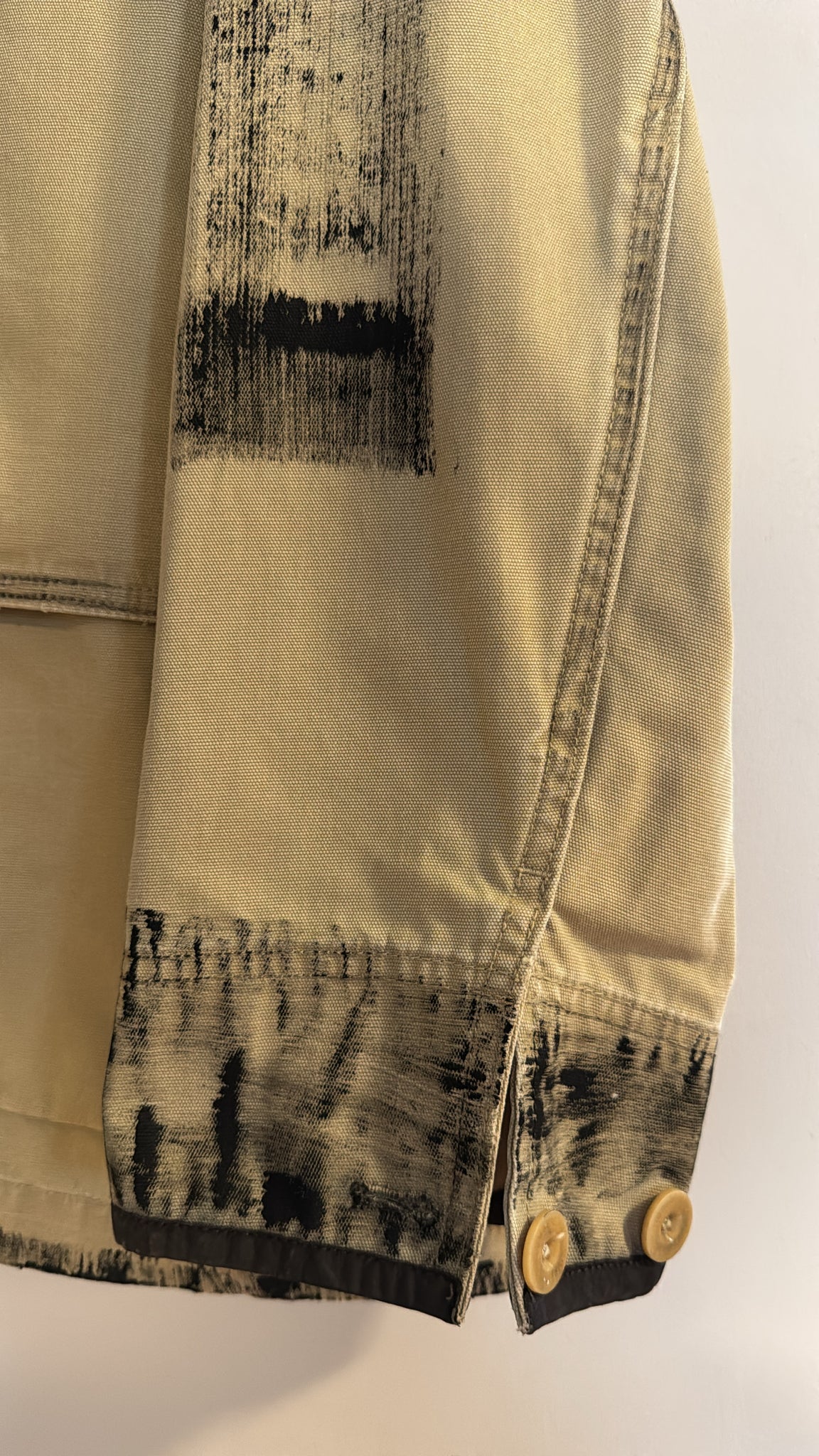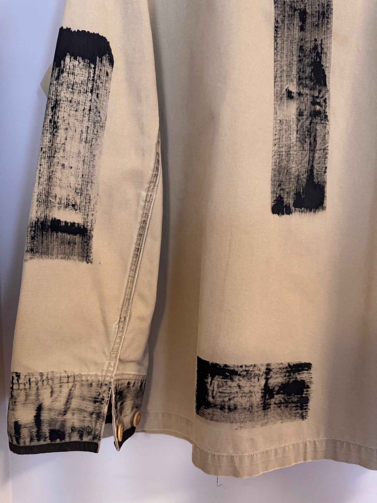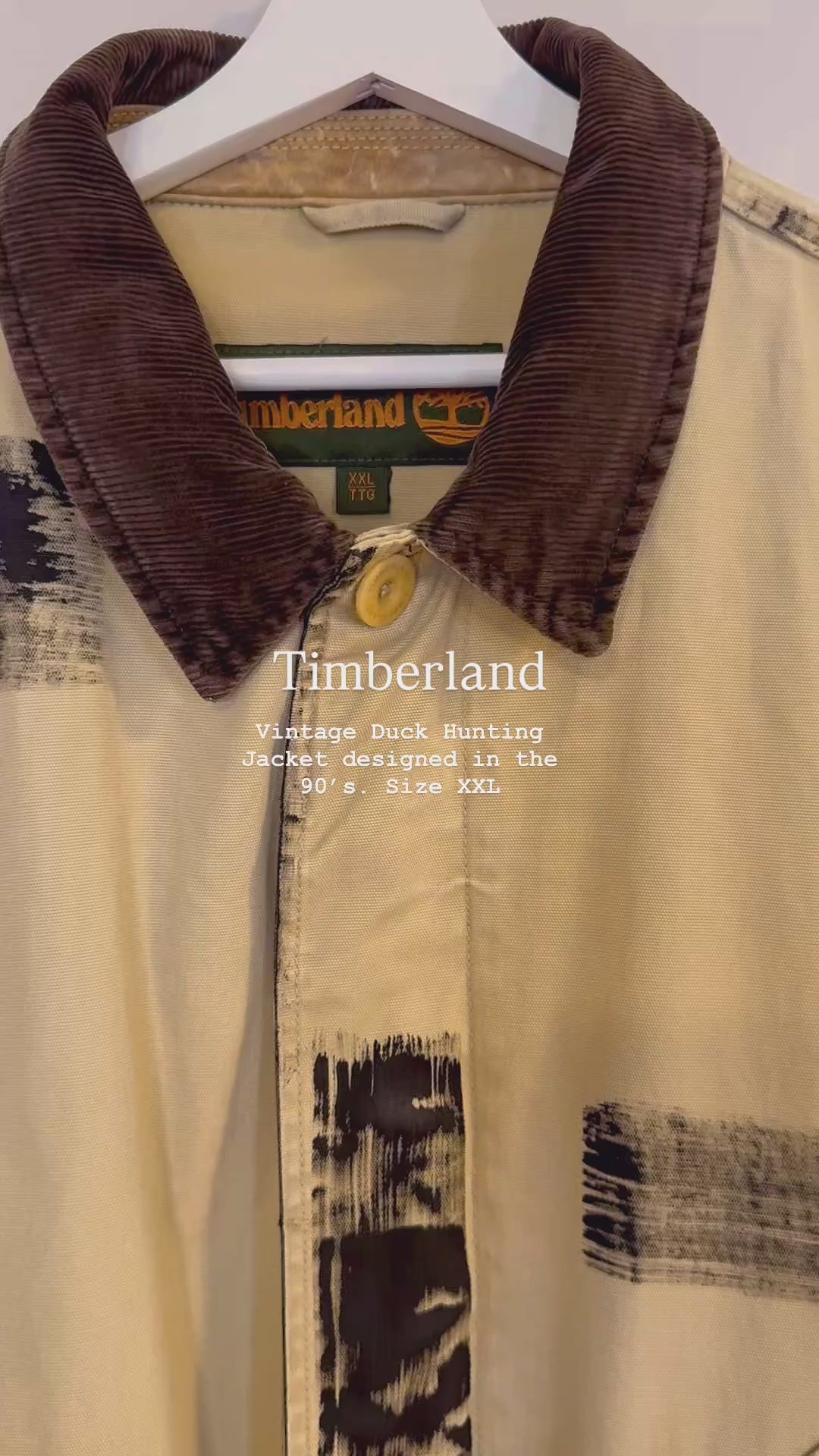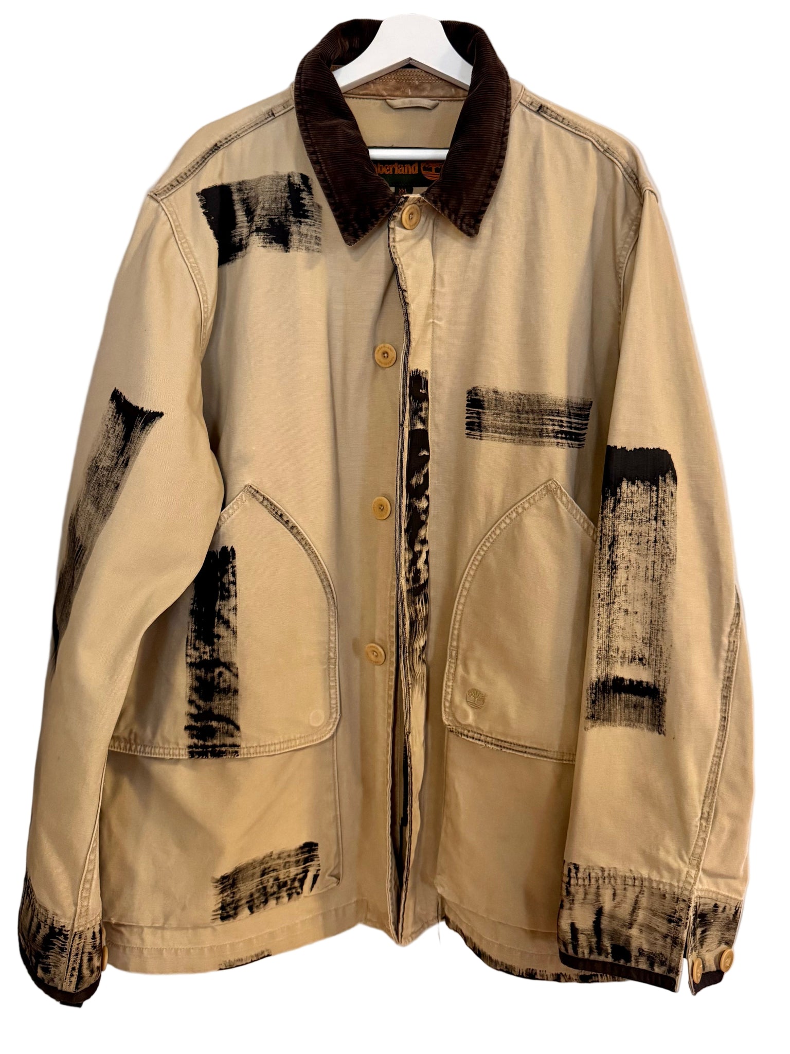 Designed in the 90's and reimagined in 2025 with hand painted Abstract designs creating a vintage/modern look. One-of-a-kind sustainable fashion. Cotton shell and leather trim around the cuff and under back collar where one of the Timberland logo's are located. This is a men's standard XXL size that's designed for a unisex fit. Styled for a perfect fit or an oversize vibe!